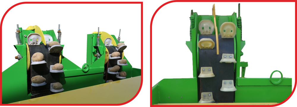 Our machine, mounted via a tractor 3-point hitch system, adjusts the potato drop distance through the wheel mechanism and features adjustable row spacing of 65–75 cm. Potatoes are picked up by specially designed cups fixed onto a rubber belt. Depending on the potato variety, small plastic inserts can be placed inside the cups. This machine delivers the best planting performance for graded potatoes when operated with two workers. For ungraded potatoes, assisted planting by an operator allows the seed count to be doubled, significantly increasing efficiency.