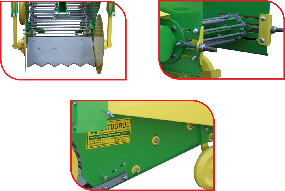 The machine is mounted to the tractor via a 3-point hitch system and receives its power from the tractor’s PTO shaft. Power transmission is completed via belt drive or optional chain drive. The digging blades positioned at the front lift the potatoes from underneath and transfer them onto the conveyor. Potatoes are cleaned and screened on the conveyor and then gently discharged onto the soil surface in rows from the rear of the machine. This model performs single-row harvesting and delivers clean and efficient operation.