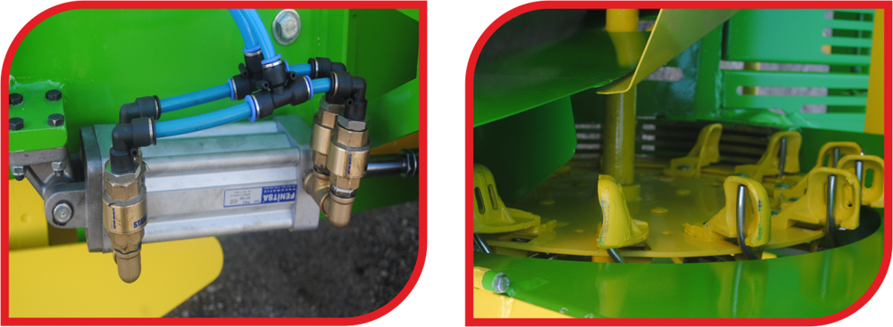 Our machine, mounted via a tractor 3-point hitch system, adjusts the potato drop distance through the wheel mechanism. The row spacing is adjustable between 65–75 cm. Potatoes are picked up by specially designed cups fixed onto a rubber belt. Depending on the potato size, small plastic inserts can be placed inside the cups. This machine delivers the best performance for graded potatoes when operated with two workers. For ungraded potatoes, assisted planting allows the seed count to be doubled, significantly increasing efficiency.