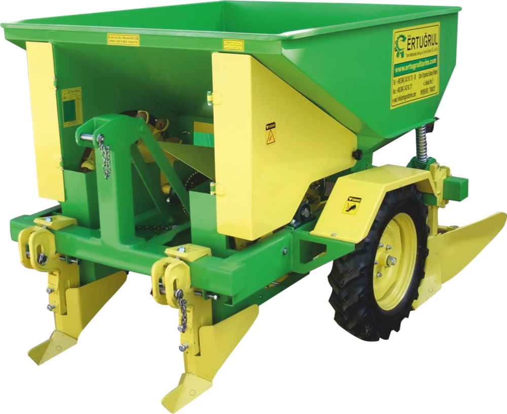 Meet our new machine, mounted via a tractor 3-point hitch system, which adjusts the potato drop distance through the wheel mechanism and offers adjustable row spacing between 35–45 cm. This machine allows planting of all types of potato seeds, provided they are graded. It features specially designed, easily removable and replaceable cups for graded potatoes. Operating without the need for manual labor, it significantly reduces labor costs. The daily planting capacity has been increased to 45–60 decares, nearly double that of standard machines. This is a first-of-its-kind machine produced by our company in Turkey, with no current competitor.