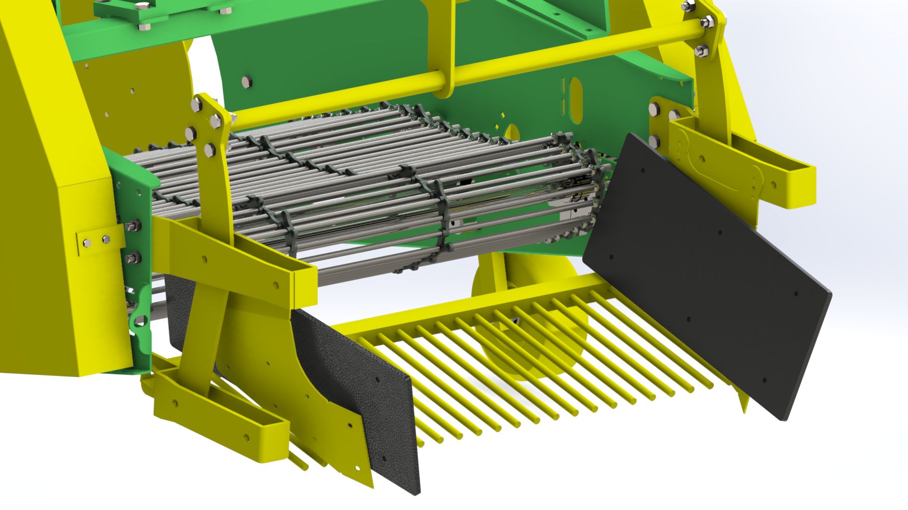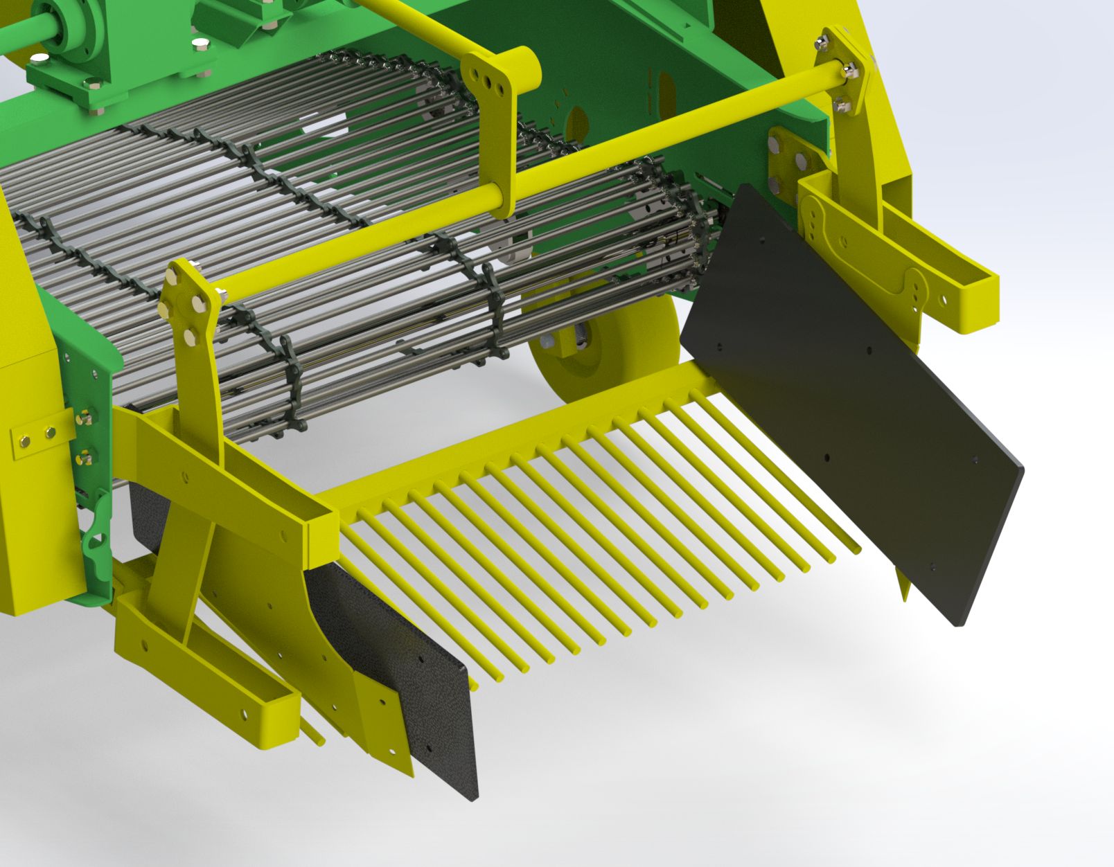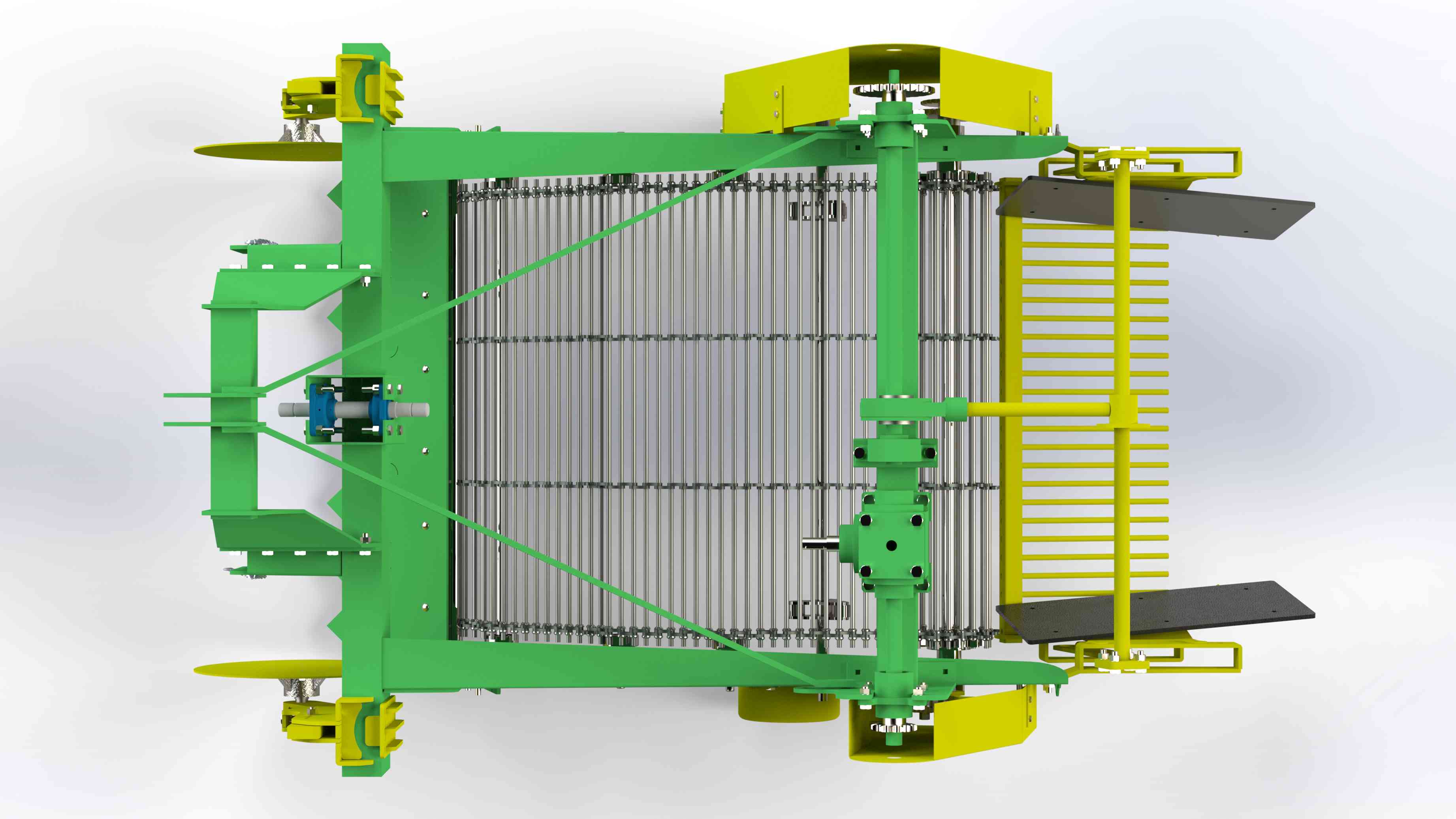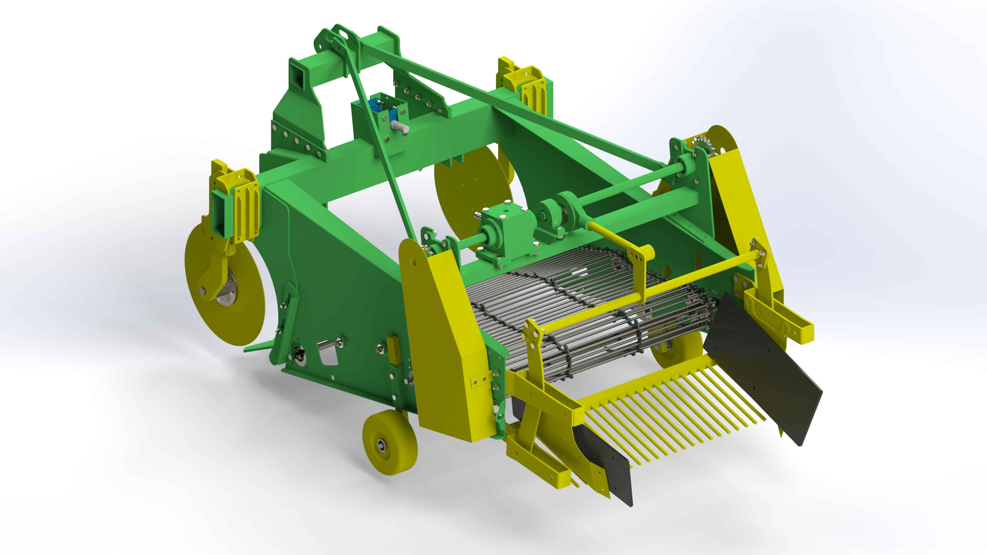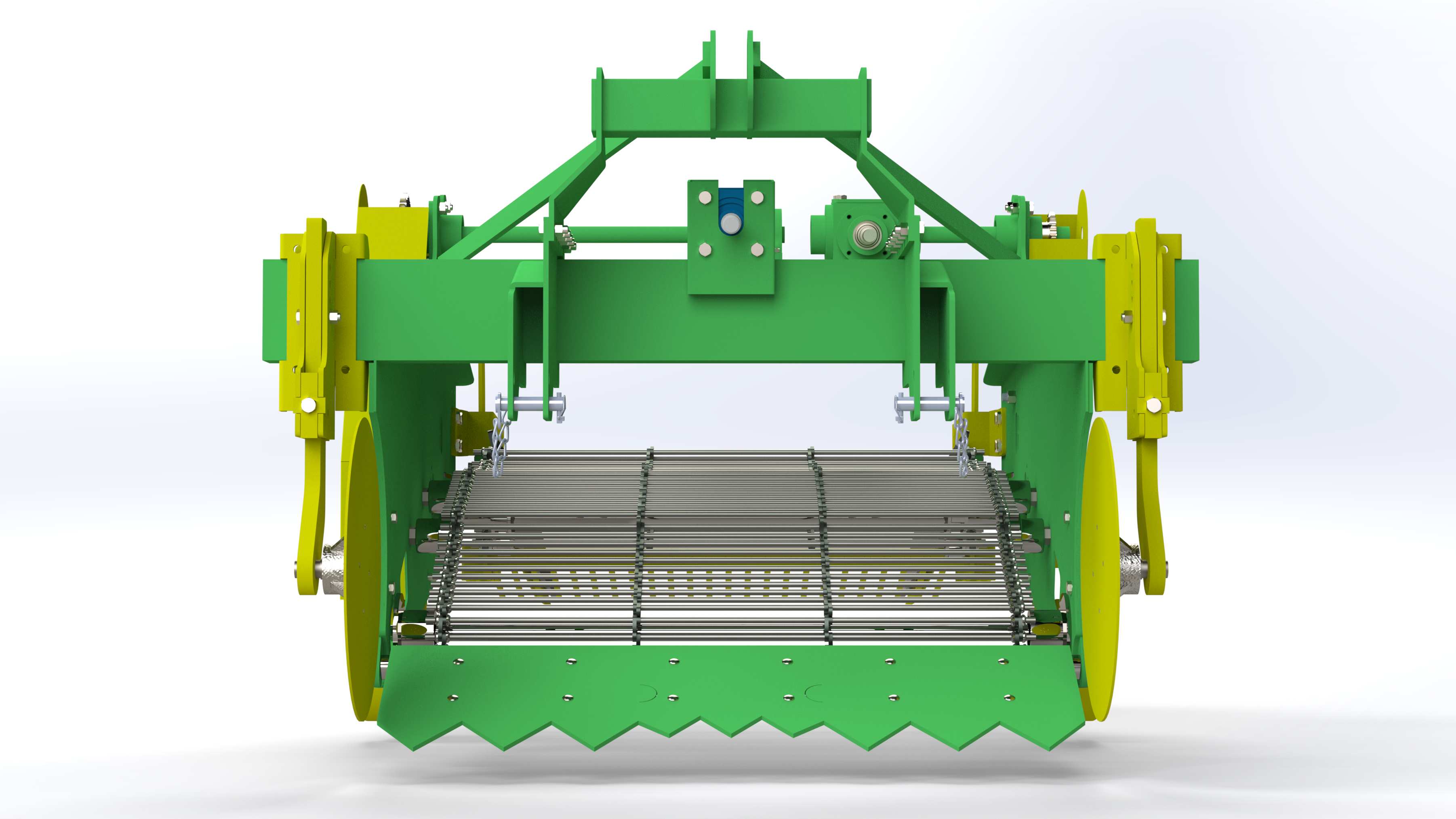 Thanks to the blades positioned in front of the potatoes, the machine lifts the crop together with the soil and loosens it before depositing it onto the soil surface in rows from the rear of the machine. The potatoes are gently conveyed between the elevator rods without being squeezed, preventing damage to the crop. The machine is mounted to the tractor via a 3-point hitch system and receives its power from the tractor’s PTO shaft. Power transmission to the conveyor system is handled by heavy-duty gearboxes, making the machine highly robust and powerful. Depending on soil structure, the number of elevator rods and rod spacing can be adjusted. With its durable construction, the machine performs reliably in heavy soil conditions, stony fields, and rainy weather. It is especially preferred by large-scale agricultural enterprises.